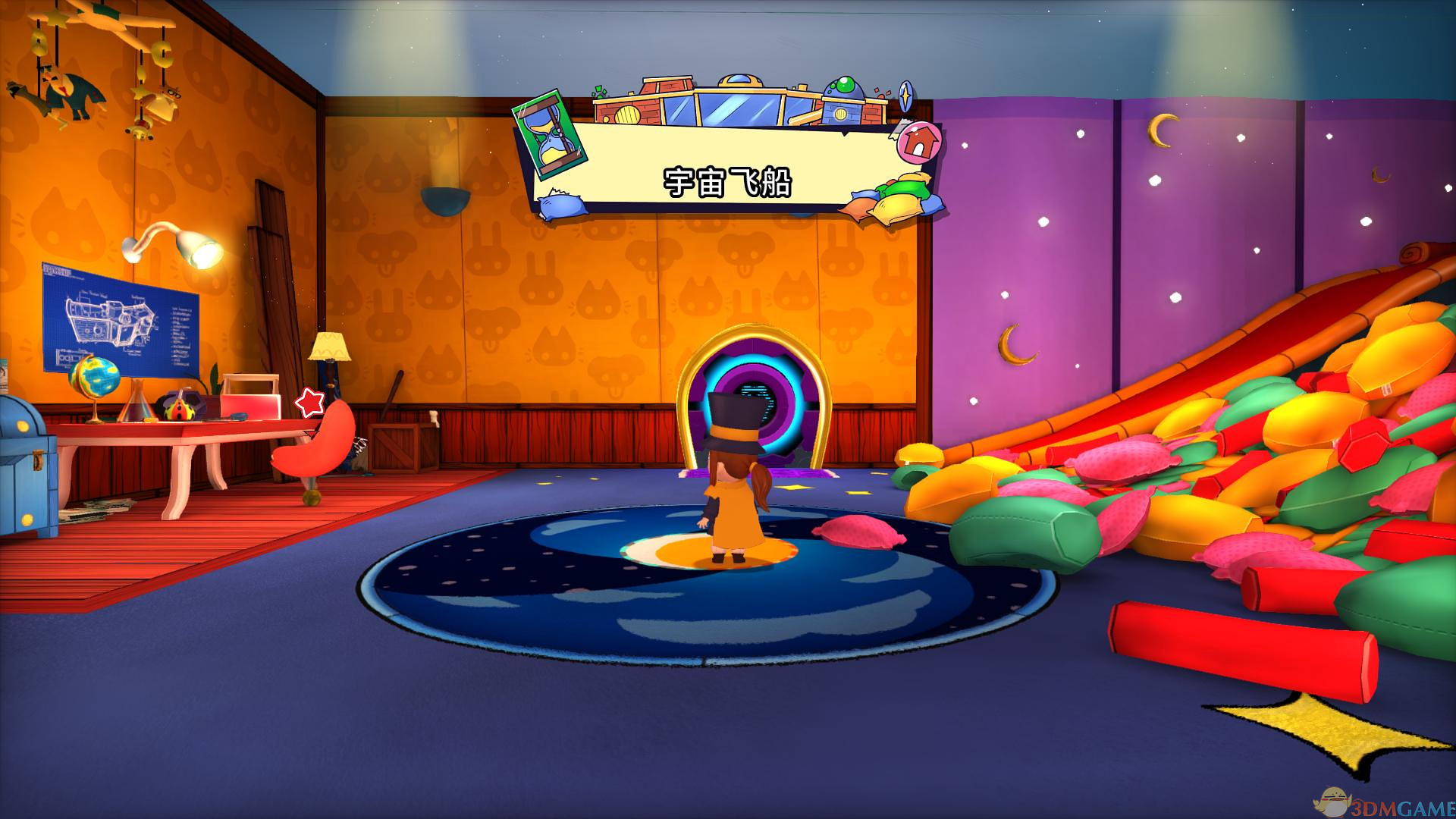 《时光之帽》的关卡设计很独特,一共将有五大关等待探索,而探索本身也将是游戏的核心,因为地图上有许多隐藏道具,将为主角带来很大帮助,主角帽子宝宝(Hat Kid)的武器是一柄雨伞,对抗敌人和boss全靠它。